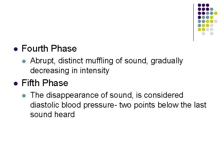 l Fourth Phase l l Abrupt, distinct muffling of sound, gradually decreasing in intensity Fifth Phase l The disappearance of sound, is considered diastolic blood pressure- two points below the last sound heard