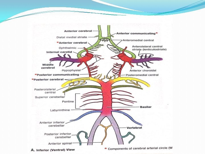 Choroid plexuses � The Anterior Choroidal A: from the Internal Carotid A supply the choroid plexus of the lateral ventricle. � The Posterior Choroidal A. : from the Posterior cerebral artery to supply the choroid plexus of the lateral ventricle and 3 rd ventricle. �The Choroidal Branch of Posterior inferior Cerebellar A – to supply choroidal plexuses of 4 th venticle