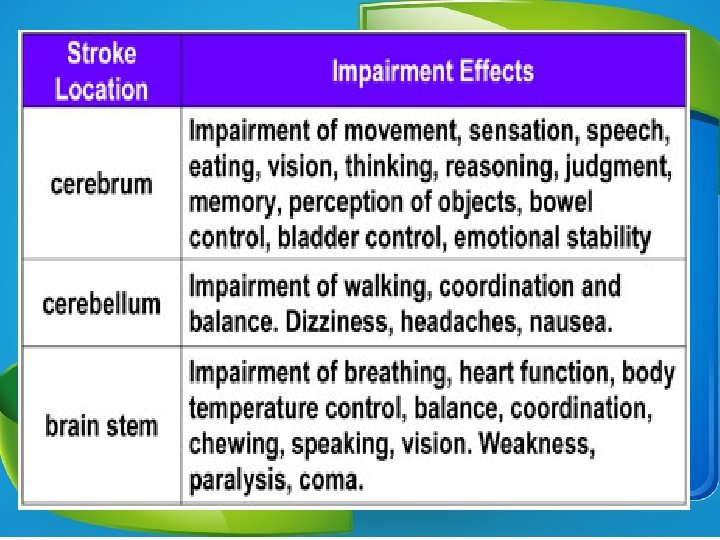 STROKE ü Stroke or cerebrovascular accident: - Blockage in the artery – cerebral infarction • Carotid artery • Basilar artery ü Bleeding within the brain – Intracerebral haemorrhage • Aneurysm • Subarachnoid haemorrhage • Hypertension