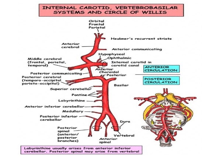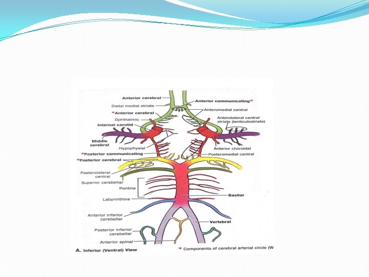 Branches of ica 1. 2. 3. 4. 5. 6. Posterior communicating artery Ophthalmic artery Hypophysial artery Anterior choroidal artery Anterior cerebral artery Middle cerebral artery
