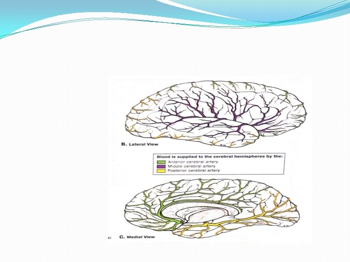 CEREBRAL ARTERIES 1. Anterior cerebral artery supply most of the medial and superior surfaces of the brain and the frontal pole. 2. Middle cerebral artery supply the lateral surface of the brain and the temporal pole. 3. Posterior cerebral artery supply the inferior surface of the brain and the occipital pole
