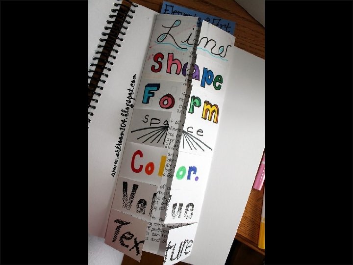 Actividad en clases *Elaboración de un tríptico en el que escriban e ilustren mediante tipografía afín los conceptos estudiados en la clase. Pasos de elaboración del tríptico: Primero: en una hoja de block realizar dos dobleces hacia el centro, dejando un espacio al medio. Segundo: dividir las aletas de la hoja en siete partes iguales. Asignar a cada una de estas partes uno de los conceptos. Tercero: realizar cortes en las aletas. Ilustrar utilizando dibujo y tipografía el nombre del concepto de acuerdo a sus características (Ej. El concepto “Color” se hace con letras de colores, el concepto “Espacio” se representa con letras en perspectiva, etc. ) Cuarto: Escribir en el interior del tríptico la definición de cada concepto investigada por el estudiante. ***La fecha de entrega es el día martes 17 de marzo al llegar a la clase de Artes Visuales (no se puede terminar el tríptico en esa sesión)***