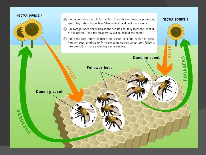 Bee Dances � Shows others type, direction and distance to food � ROUND DANCE: source of food <50 m from hive � WAGGLE DANCE: source of food >50 m from hive