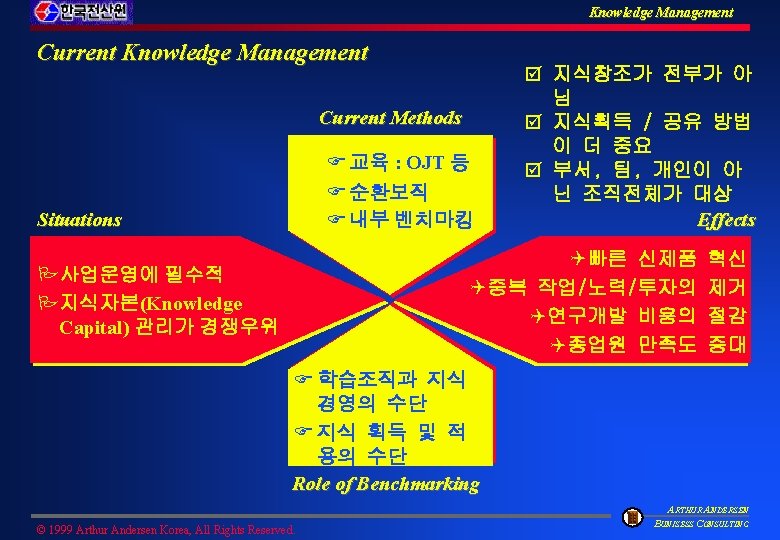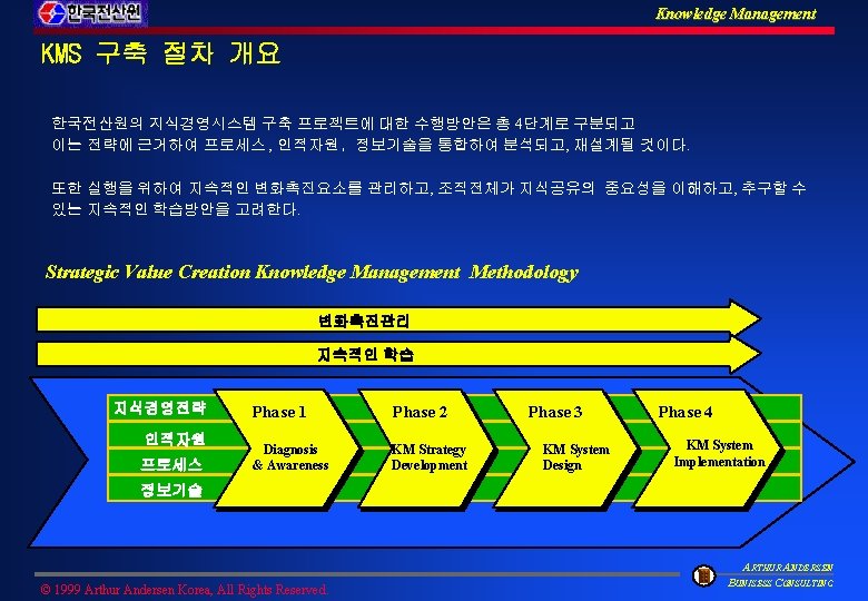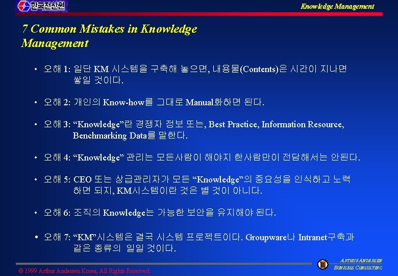 Knowledge Management Major Four Phases I. Diagnosis & Awareness IV. KM System Implementation • KMAT Diagnostic • OLI Workshop • Analysis of Systems Change KM System Development Phases • Software Pilot Application & Implementation • Human Resource Mgt. • Creation and Transfer of Best Practices • Change Evaluation II. KM Strategy Development • Knowledge Strategy Workshop • Strategy Design and Development III. KM System Design • KM Blue Print • Process Design • Performance Measurement Systems • Software Selection • Systems Design © 1999 Arthur Andersen Korea, All Rights Reserved. ARTHUR ANDERSEN BUNISESS CONSULTING
