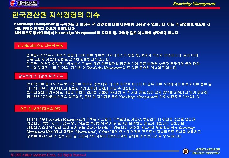 ARTHUR ANDERSEN BUSINESS CONSULTING KNOWLEDGE MANAGEMENT COMPETENCY CENTER Knowledge Management 한국전산원 지식경영 1999년 2월 아더앤더슨코리아 정 병 헌 © 1999 Arthur Andersen Korea, All Rights Reserved. ARTHUR ANDERSEN BUNISESS CONSULTING