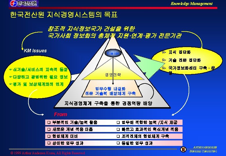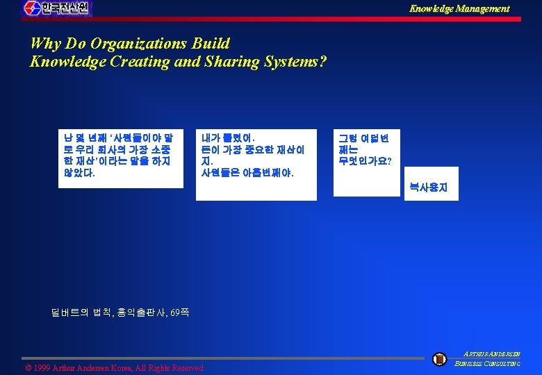 Knowledge Management Agenda 1. 지식경영이란? 2. 한국전산원의 지식경영 구축 방향 3. 아더앤더슨 소개 © 1999 Arthur Andersen Korea, All Rights Reserved. ARTHUR ANDERSEN BUNISESS CONSULTING