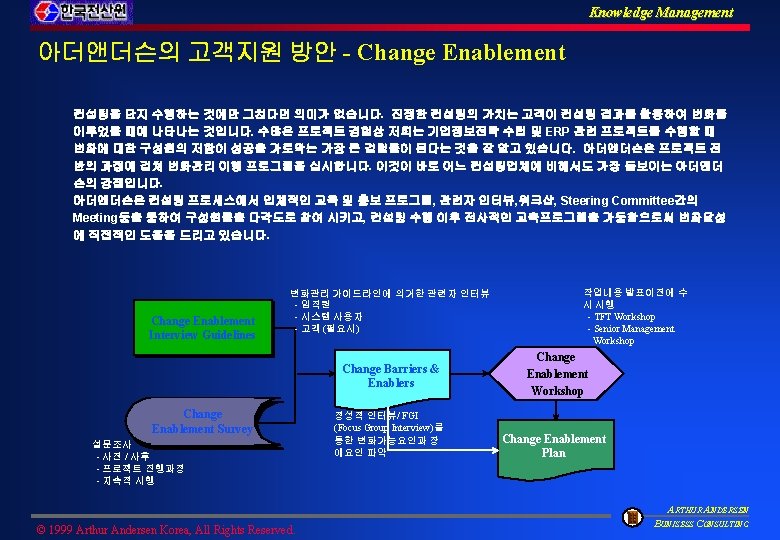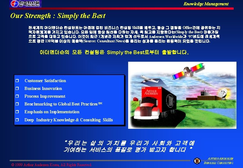 Knowledge Management Why Arthur Andersen? How does Knowledge Management Related To Our Other Services? Technology Services Process Management Knowledge Strategy Change Enablement The role of knowledge in achieving the business objectives Business Objectives The Client’s Strategy Cost Management © 1999 Arthur Andersen Korea, All Rights Reserved. ARTHUR ANDERSEN BUNISESS CONSULTING