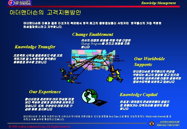 Knowledge Management 아더앤더슨의 고객지원 방안 - Knowledge Capital Each of our project teams comes equipped with the vast array of resources and knowledge capital of Andersen Worldwide. These resources include subject area specialists, knowledge bases and methodologies that enable our people to bring the accumulated expertise of our entire Firm to bear on each client engagement, including: · CLIENT/SERVER · Model Process Model Workflow Analyze Business Area Code Alpha Test Specify Modules Model Data Develop Prototype Prepare for Rollout Beta Release Unit Test Refine Documentation Train Beta Test Refine Beta © 1999 Arthur Andersen Korea, All Rights Reserved. Release Convert Support Advanced Technology Group - Housed at our Technology Innovation Center in Atlanta, the Advanced Technology Group (ATG) is a unique collection of technical experts that maintains deep product expertise in all of the leading client/server environments. Their technical knowledge base is further supplemented by working partnerships that Andersen has forged with most of the leading technology vendors, including Oracle, Sybase, Borland, Hewlett-Packard, Novell and Lotus. Knowledge. Space. TM - We have synthesized our methodologies for process improvement, systems development and project management, as well as our accumulated engagement experience base and research into an intranet environment that we call Knowledge. Space. This tool provides a consistent, structured framework for client projects that reflects experience accumulated from thousands of engagements. The benefit to our clients is superior product quality delivered in shorter time frames. ARTHUR ANDERSEN BUNISESS CONSULTING