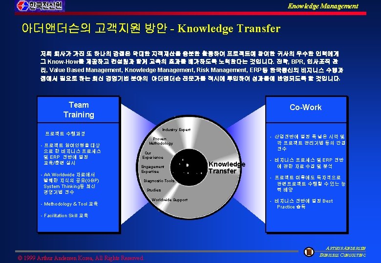 Knowledge Management Why Arthur Andersen? Use and Show AA’s Tools • Knowledge Management Assessment Tool. TM (KMATTM) • Knowledge. Space. TM and Lotus Notes (AAOL, Client Service Connection, etc. ) • External Knowledge. Space. TM • Best Practices, Competency Center Structure, Organization and Process • Client Credentials, Recognition and Experience © 1999 Arthur Andersen Korea, All Rights Reserved. ARTHUR ANDERSEN BUNISESS CONSULTING