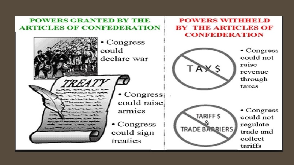 STRENGTHS OF THE ARTICLES 1 To declare war and make peace. 2 To coin and borrow money 3 To trade with foreign countries and sign treaties 4 To operate post offices 5 Government signed a treaty of alliance with France in 1778. 6 Government successfully waged a war for independence against the British. Government negotiated an end to the American Revolution in the Treaty of Paris, signed in 1783. 7 Government granted the free inhabitants of each state “all the privileges and immunities of free citizens in the several states. ” 8 Government provided for the eventual admission of Canada into the Confederation. 9 Government passed the Northwest Ordinance of 1787, which allowed the Northwest Territories to organize their own governments. It allowed the eventual admission to the Union of no more than five states, and no fewer than three, “on an equal footing with the original states. ” The Ordinance also banned slavery from the region. 10 Government established the Departments of Foreign Affairs, War, Marine, and Treasury.