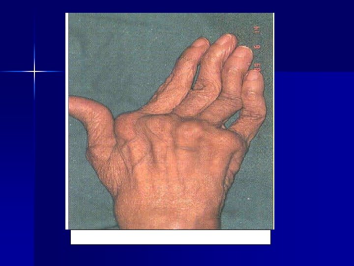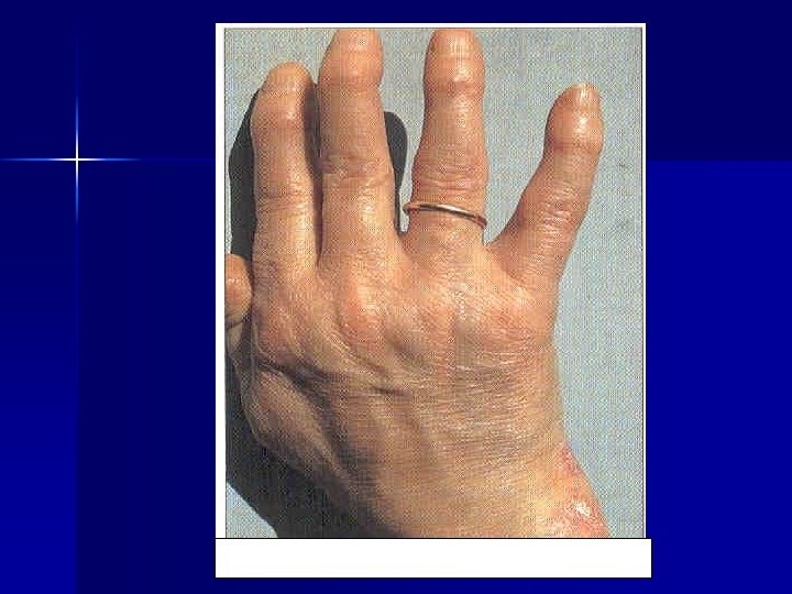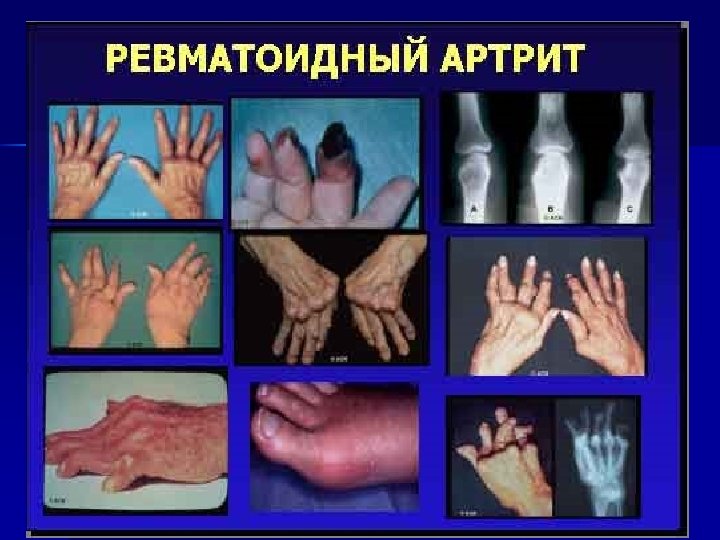 Major key manifestations: • Characteristic rentgnography changes (stage 4: osteoparosis, joint space narrowing, and ankylosis uzuratsiya) • Quick regional atrophy of the muscles. • The appearance of painless moving rheumatoid nodules; • Rheumatoid factor (reaction Voler - Rose, latex test) • Visceral (pleurisy, gastritis, liver enlargement, myocarditis, perekardit, amyloidosis kidney polyserositis and others. ) • Hyper α 1, α 2 gammaglobulinemiya Islands; ↑ Subtitle Creactive protein, ↑ ESR