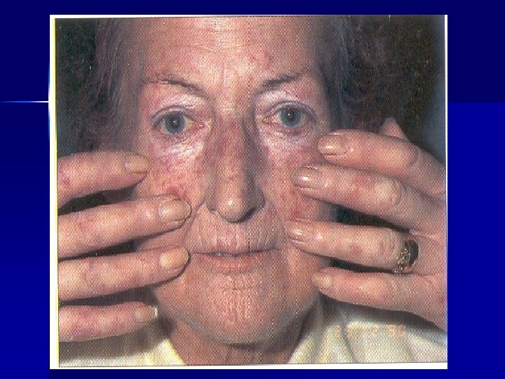 Leading clinical features that are crucial in the diagnosis of SLE: Ø Ø Ø Lupus "butterfly" discoid lupus Raynaud's syndrome alopecia photosensitization ulceration of the mucous membrane of the nasopharynx (stomatitis) Nephritis, carditis, Polyserositis (pneumonia, pleurisy and (or) pericarditis) Psychosis and (or) seizures with seizures LE-cell test, false-positive Wassermann test Verlgofa syndrome, hemolytic anemia, and (or) leukopenia and (or) thrombocytopenia.