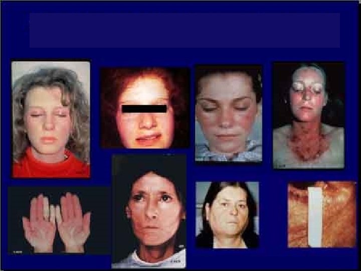 Leading clinical features that are crucial in the diagnosis of SD: l Typical skin changes - periorbital edema and erythema symptom score), telangiectasia l 2. progressive weakness, myalgia, edema, and further muscle atrophy (proximal parts of the limbs) l 3. The muscle biopsy (degeneration, necrosis, basophilia, inflammatory infiltrate, fibrosis); l 4. increase : CPK, aldolase, transaminase l 5. The electromyographic muscle changes. l 6. Calcification; l 7. Dysphagia;
