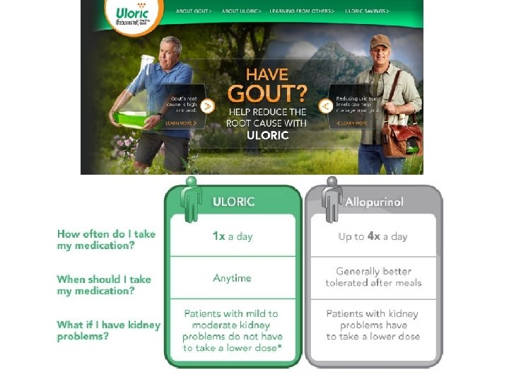 Joint Disorders • Gouty arthritis – Also referred to as just Gout – Excessive uric acid in blood – Crystals get deposited in synovial fluid – Chronic inflammation and tissue damage – Swelling, tenderness – Pin in wrists, fingers, ankles, knees, elbows – Treat with Allopurinol (inhibits uric acid synthesis) and Uloric (new med)