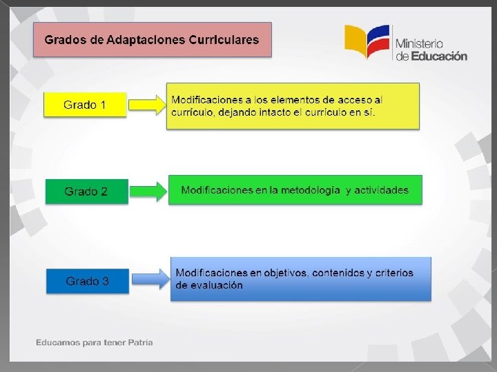 • Se les aplicará las mismas evaluaciones y parámetros de calificación GRADO 3 • Se les aplicará las mismas evaluaciones y parámetros de calificación GRADO 2 GRADO 1 EVALUACIÓN SUMATIVA • Evaluaciones diferenciadas. • Para estudiante de 3 ero Bachillerato y se presentan para SER BACHILLER con Carné o documento de UDAI.