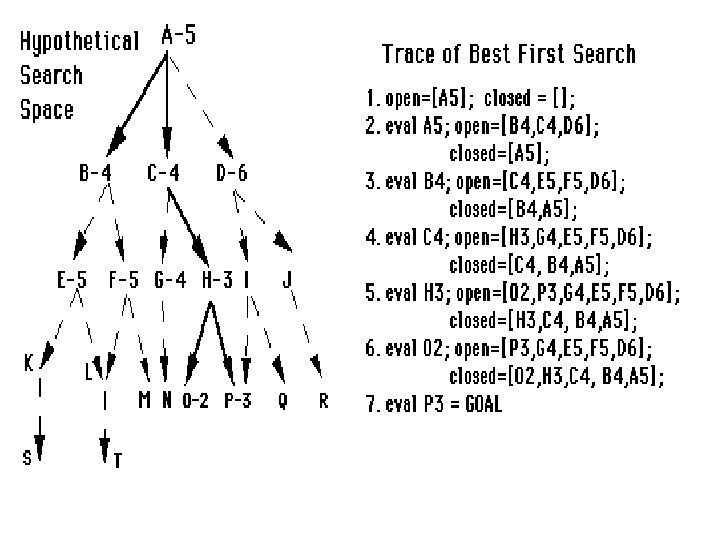 Greedy Best-First Search Algorithm Input: State Space Ouput: failure or path from a start state to a goal state. Assumptions: L is a list of nodes that have not yet been examined ordered by their h value. The state space is a tree where each node has a single parent. 1. 2. Set L to be a list of the initial nodes in the problem. While L is not empty 1. 2. Pick a node n from the front of L. If n is a goal node 1. stop and return it and the path from the initial node to n. Else 1. remove n from L. 2. For each child c of n 1. insert c into L while preserving the ordering of nodes in L and labelling c with its path from the initial node as well as its h value. End for End if End while Return failure