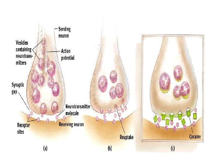 IE. Cocaine ¡Cocaine blocks the reuptake of dopamine (pleasure), norepinepherine (energy), and serotonin (arousal), so the feelings generated by those neurotransmitters intensifies as they linger in the synapse longer