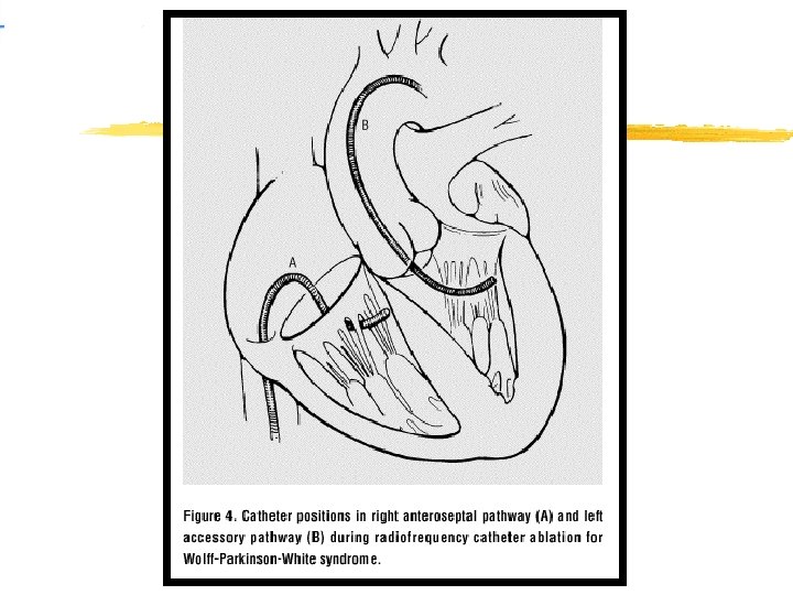 RADYOFREKANS ABLASYON z. Atriyal ya da ventriküler erken vurular yardımı ile taşikardi başlatılır. z. Taşikardiyi oluşturan merkez saptandığında yönlendirilebilen bir ablasyon kateteri yardımı ile triküspit anulusun arkasına geçilir.