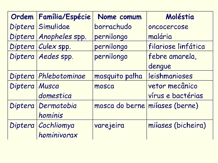 Diptera • Psychodidae: flebotomíneos • Simuliidae: borrachudos. Aproximadamente 1. 000 espécies no mundo • Culicidae: pernilongos. Aproximadamente 3. 000 espécies no mundo • Muscidae: moscas. Compreende as motucas, as moscas domésticas e a mosca tse-tse • Ceratopogonidae: mosquito pólvora • Tabanidae: moscas do gado e dos cavalos