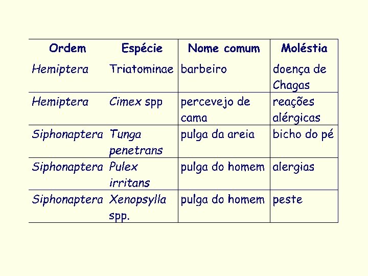 Artrópodes de importância médica – Hemiptera – espécies hematófagas: – Reduviidae - Triatominae (barbeiros) – Cimicidae - percevejos de cama – hemimetábolos – todos os estágios e ambos os sexos são hematófagos