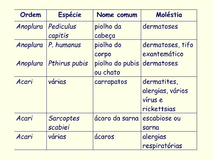 Piolhos • P. humanus: piolho do corpo • ovos nas fibras da roupa em contato com a pele • muito sensível a mudanças de temperatura e umidade • abandona seu hospedeiro quando ele está com febre ou quando morre • Vetor do tifo exantemático, causado por Rickettsia prowazekii • tratamento e controle: troca e lavagem de roupas; uso de inseticidas (desabrigados, sem-teto)