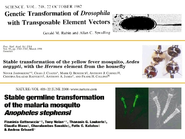 Transgenic anopheline mosquitoes impaired in transmission of a malaria parasite Nature 2002, vol 417: 452 -455 Ito, J. , Ghosh, A. , Moreira, L. A. , Wimmer, E. A. , Jacobs-Lorena, M. Linhagem estável de transgênico com SM 1 (obtido por uma biblioteca de phago-display) Fitness of anopheline mosquitoes expressing transgenes that inhibit Plasmodium development Genetics 2004, vol 166: 1337 -1341 Moreira, L. A. , Wang, J. , Collins, F. H. , Jacobs-Lorena, M. Parâmetros analisados: sobrevivência, fecundidade, fertilidade medida em mosquitos mantidos em “gaiolas”. Diferenças no fitness de mosquitos transformados com SM 1 e fosfolipase. SM 1 = não transg. ; Foslip < não transg. Transgenic malaria-resistant mosquitoes have a fitness advantage when feeding on Plasmodium-infected blood Proc Natl Acad Sci U S A, 2007, vol 104: 5580 -5583 Marrelli, M. T. , Li, C. , Rasgon, J. L. , Jacobs-Lorena, M.
