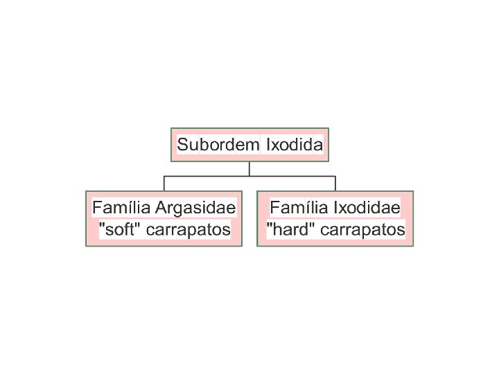 Carrapatos e Ácaros Filo arthropoda Subfilo chelicerata Classe arachnida Subclasse acari Ordem parasitiformes Subordem ixodida * (carrapatos) (hematófagos obrigatórios) Subordem opilioacarida Subordem holothyrida Subordem gamasida * Ordem acariformes Subordem prostigmata * Subordem astigmata * Subordem oribatida *