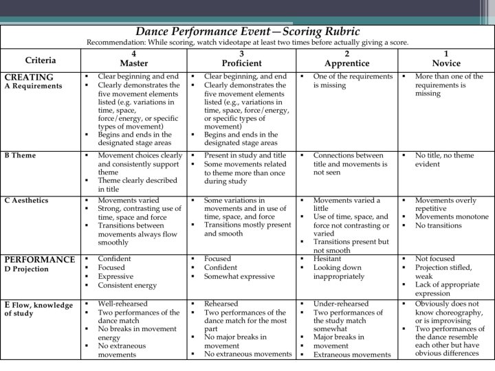 Performance/Portfolio Items Part Task Descriptions DANCE Standards 1 -4 Performance Indicators May Vary A Mandatory trio or duet choreography and performance, with required elements, notation, and reflective questions. The choreography is to be inspired by another art form. The performance is to be no longer than five minutes. B A research project in which the student researches anatomical structures and relates them to dance movement through narrated demonstration. May also include demonstrating some section of class work (such as warm-up, or a specific step or movement) while relating the exercise to anatomical structures. C Student-selected work that demonstrates proficiency in a standard not yet adequately represented in the portfolio. D The self-assessment task gives the student the opportunity to assess himself/ herself and his/her level of achievement in the four standards.