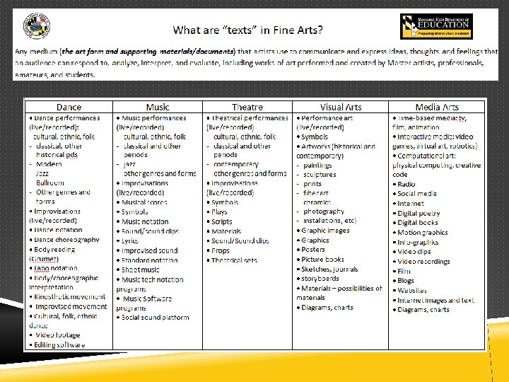 TERMINOLOGY For today’s purposes, we will use Common Core State Standards, as they are the foundation of the MCCRS. Turn-and-Talk to your elbow partner… What is the difference between: Arts Education Arts Exposure Arts Integration