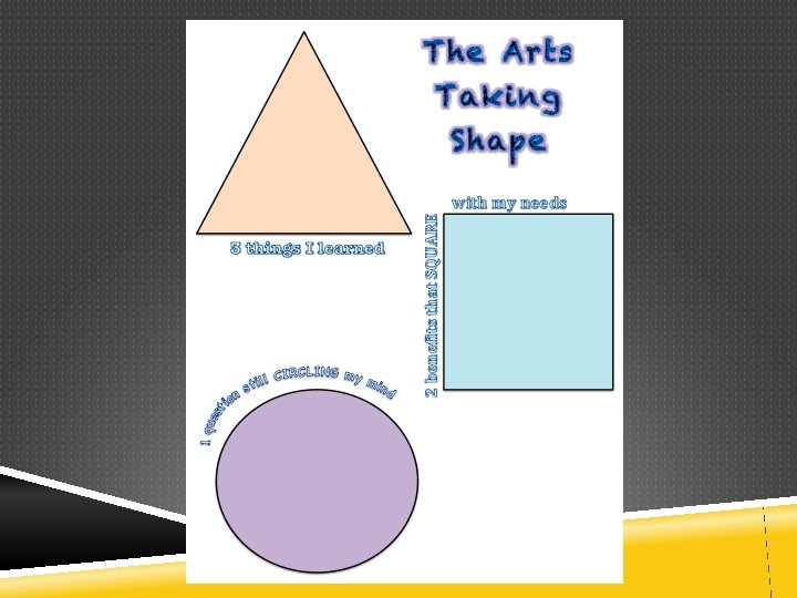 CURRENTLY, IN AN ARTS CLASS Standard 1. 0 - Perceiving and Responding: Aesthetic Education Students will demonstrate the ability to perceive, interpret, and respond to ideas, experiences, and the environment through visual art. Standard 2. 0 - Historical, Cultural, and Social Context Students will demonstrate an understanding of visual art as an essential aspect of history and human experience. Standard 3. 0 - Creative Expression and Production Students will demonstrate the ability to organize knowledge and ideas for expression in the production of art. Standard 4. 0 - Aesthetics and Criticism Students will demonstrate the ability to make aesthetic judgments. (www. MDK 12. org)