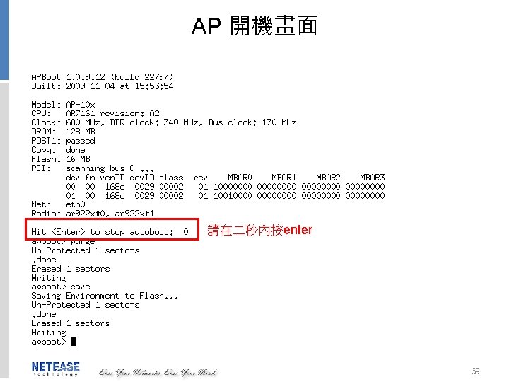 AP setting command l 清空指令 purge l 修改ap 的ip setenv ipaddr x. x setenv netmask x. x setenv gatewayip x. x setenv name xxx l 存檔save l 顯示設定print l 重開 boot 70