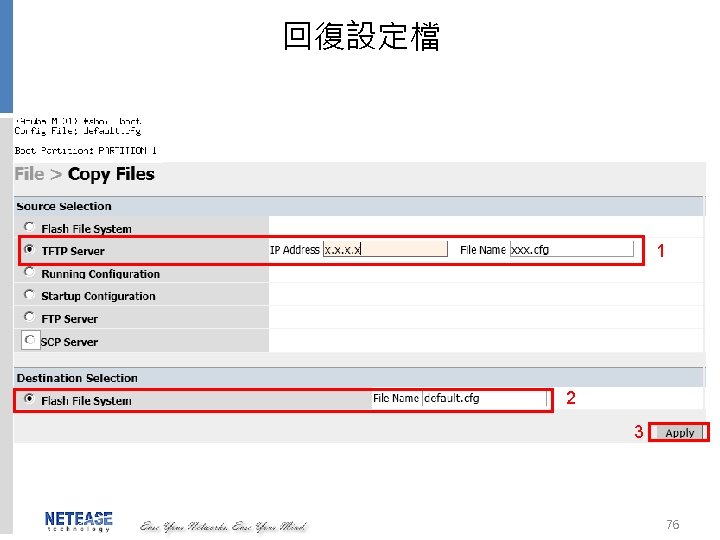 備份設定檔 l 備份startup config至tftp server 1 2 Ip address: x. x File name: xxxx. cfg 3 75