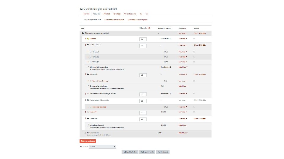 Moodlen arviointikirja • Moodlen arviointikirjaan voi koostaa osasuorituksia, joista Moodle laskee esim. keskiarvon loppuarvosanaksi. Loppuarvosanan voi lähettää myöhemmin takaisin Sisuun, josta se hyväksytään toteutuksen arvosanaksi. • Kategoriat: esim. Demo-pisteet voidaan koostaa yhteen kategoriaan • Osasuoritukset: • Moodle-kurssialueen kaikki (arvioitavat) aktiviteetit menevät suoraan arviointikirjaan • opettaja voi lisätä uusia arviointikohteita, joihin syötetään manuaalisesti arvosanoja