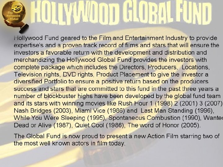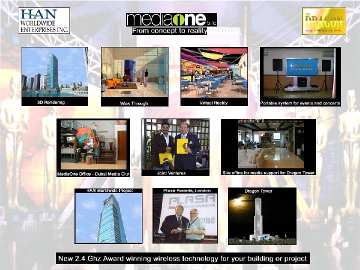 n n GDIH is presently discussing with our consortium members to develop a partnership to provide turnkey real estate services from finding the property to architectural design and construction through to marketing and sales of the projects through GDIH’s consortium groups such as Coldwell Banker and Colliers International to create specific awareness to projects being developed through GDIH’s strong relationships in providing the best in the real estate development with proven technology and management to ensure clients and investors on time delivery and favourable returns on investments. Media Partner Media. One Fz LLC will be GDIH’s media partner to develop brand promote both web presence and live events for launch of GD Tower in Dubai. And Develop state of the art technology for the buildings, media and marketing to expand GDIHS’s media reach to international exposure with major clients.
