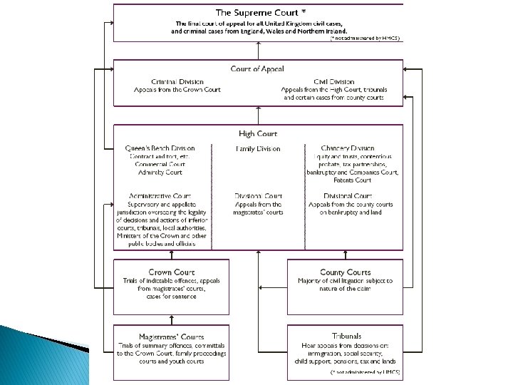 The Supreme Court � In October 2009, The Supreme Court replaced the Appellate Committee of the House of Lords as the highest court in the United Kingdom � Consists of 12 Justices who are now separate from Government and Parliament � The Court hears appeals on arguable points of law of the greatest public importance, for the whole of the United Kingdom in civil cases