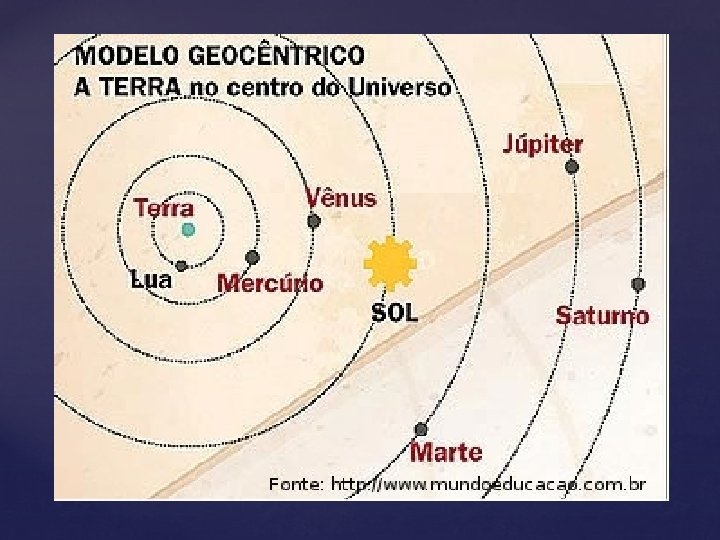 NOÇÕES HISTÓRICAS SOBRE O SISTEMA SOLAR GEOCENTRISMO: - Defendida no séc. II por Claudio Ptolomeu (87 -151 d. C) e aceita até o século XVI. - Essa teoria afirmava que a Terra era o centro do Universo, e que os outros astros, inclusive o Sol, girava em torno dela.