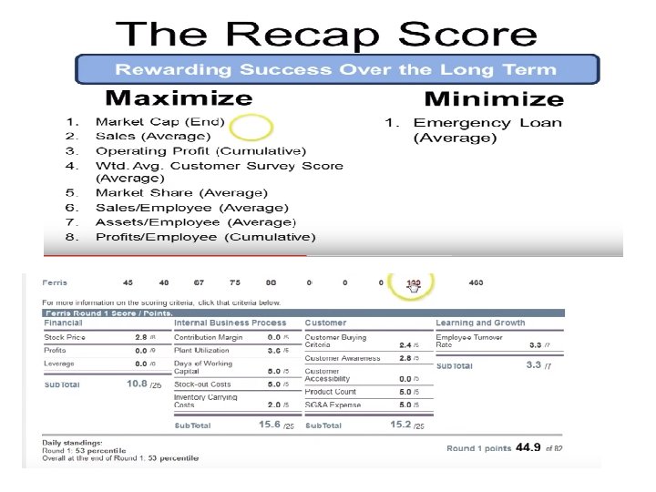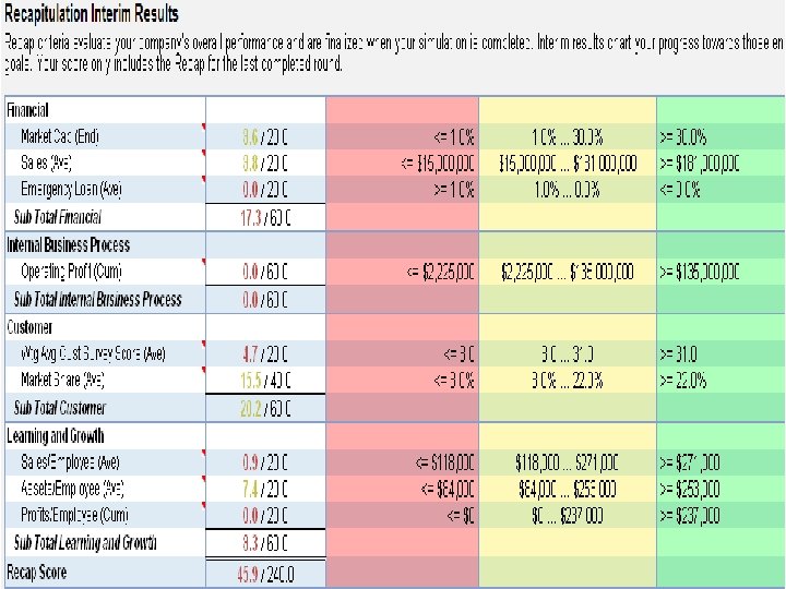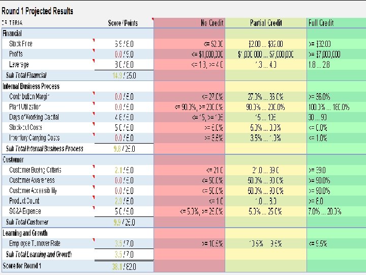 A Complete Scorecard is a Program for Action Strategic Theme: Operations Operating Excellence Efficiency Profits and RONA Financial Grow Revenues Customer Fewer planes Attract & Retain More Customers On-time Service Lowest prices Internal Objectives • More Customers • # Customers • Flight is on -time • FAA On Time Arrival Rating • Lowest prices • Market Survey turnaround Ground crew alignment • 12% growth • Customer • Ranked #1 loyalty • Ranked #1 program • Quality management • On Ground Time • 30 Minutes • Cycle time • On-Time • 90% optimization Departure • Ground crew Learning Targets Initiatives • 30% +/yr • Profitability • Grow Revenues • 20% • Fewer planes • 5% • Fast ground turnaround Measures alignment • % Ground crew • yr. 1 trained • % Ground crew stockholders 70% yr. 3 90% yr. 5 100% • Ground crew training • ESOP