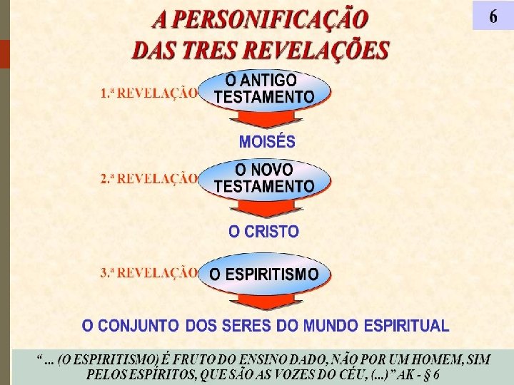 A Evolução. A Sobrevivência do Espírito após a morte. As Comunicações. (Fenômenos. Mediúnicos). Podemos sintetizar a 3ª Revelação com a máxima: Fora da caridade não há salvação. As Três Revelações, cada uma a seu tempo veio trazer novos horizontes à Humanidade: