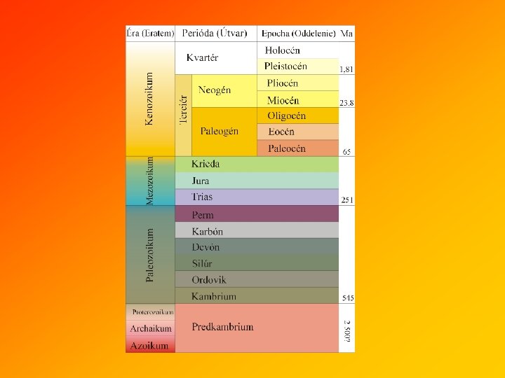 časovo-stratigrafické jednotky - sú sledy vrstiev, ktoré sa utvorili v časovom intervale zodpovedajúcom niektorej jednotke geologického času • náplňou sú rôzne horniny rovnakého veku • rozhrania sú plochy rovnakého veku (na rozdiel od litostratigrafických jednotiek) jednotky geologického času Eon Éra Perióda Epocha Vek časovo-stratigrafické jednotky eonotem eratem útvar oddelenie stupeň príklad fanerozoikum mezozoikum jura malm oxford