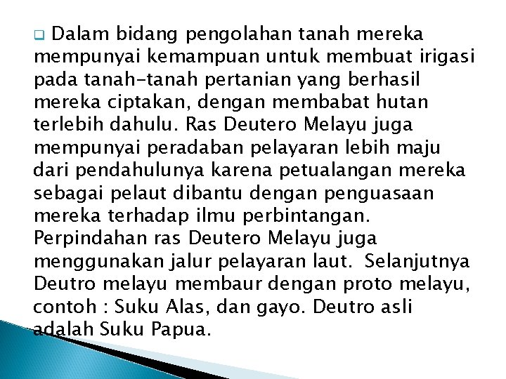 Dalam bidang pengolahan tanah mereka mempunyai kemampuan untuk membuat irigasi pada tanah-tanah pertanian yang berhasil mereka ciptakan, dengan membabat hutan terlebih dahulu. Ras Deutero Melayu juga mempunyai peradaban pelayaran lebih maju dari pendahulunya karena petualangan mereka sebagai pelaut dibantu dengan penguasaan mereka terhadap ilmu perbintangan. Perpindahan ras Deutero Melayu juga menggunakan jalur pelayaran laut. Selanjutnya Deutro melayu membaur dengan proto melayu, contoh : Suku Alas, dan gayo. Deutro asli adalah Suku Papua. q