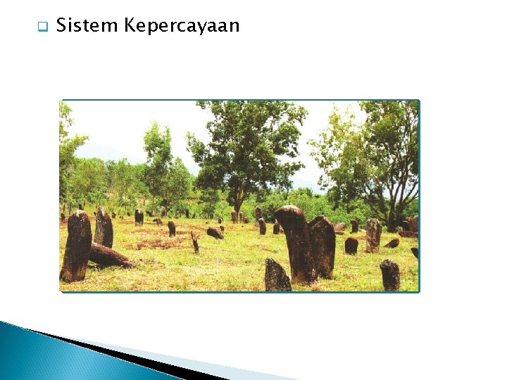 Sistem Kepercayaan (Hal 45) Nenek moyang kita mengenal kepercayaan kehidupan setelah mati. Mereka percaya pada kekuatan lain yang maha kuat di luar dirinya. Mereka selalu menjaga diri agar setelah mati tetap dihormati. Berikut ini kita akan menelaah bagaimana sistem kepercayaan manusia zaman pra-aksara, yang menjadi nenek moyang kita. Perwujudan kepercayaannya dituangkan dalam berbagai bentuk diantaranya karya seni. Satu di antaranya berfungsi sebagai bekal untuk orang yang meninggal. Tentu kamu masih ingat tentang perhiasan yang digunakan sebagai bekal kubur. Seiring dengan bekal kubur ini, maka pada zaman purba manusia mengenal penguburan mayat. Pada saat inilah manusia mengenal sistem kepercayaan Sebelum meninggal manusia menyiapkan dirinya dengan Membuat berbagai bekal kubur, dan juga tempat penguburan yang menghasilkan karya seni cukup bagus pada masa sekarang. Untuk itulah kita mengenal dolmen, sarkofagus, menhir dan lain sebagainya.