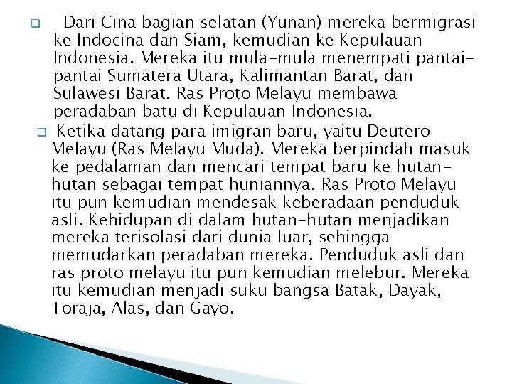 Dari Cina bagian selatan (Yunan) mereka bermigrasi ke Indocina dan Siam, kemudian ke Kepulauan Indonesia. Mereka itu mula-mula menempati pantai Sumatera Utara, Kalimantan Barat, dan Sulawesi Barat. Ras Proto Melayu membawa peradaban batu di Kepulauan Indonesia. q Ketika datang para imigran baru, yaitu Deutero Melayu (Ras Melayu Muda). Mereka berpindah masuk ke pedalaman dan mencari tempat baru ke hutan sebagai tempat huniannya. Ras Proto Melayu itu pun kemudian mendesak keberadaan penduduk asli. Kehidupan di dalam hutan-hutan menjadikan mereka terisolasi dari dunia luar, sehingga memudarkan peradaban mereka. Penduduk asli dan ras proto melayu itu pun kemudian melebur. Mereka itu kemudian menjadi suku bangsa Batak, Dayak, Toraja, Alas, dan Gayo. q