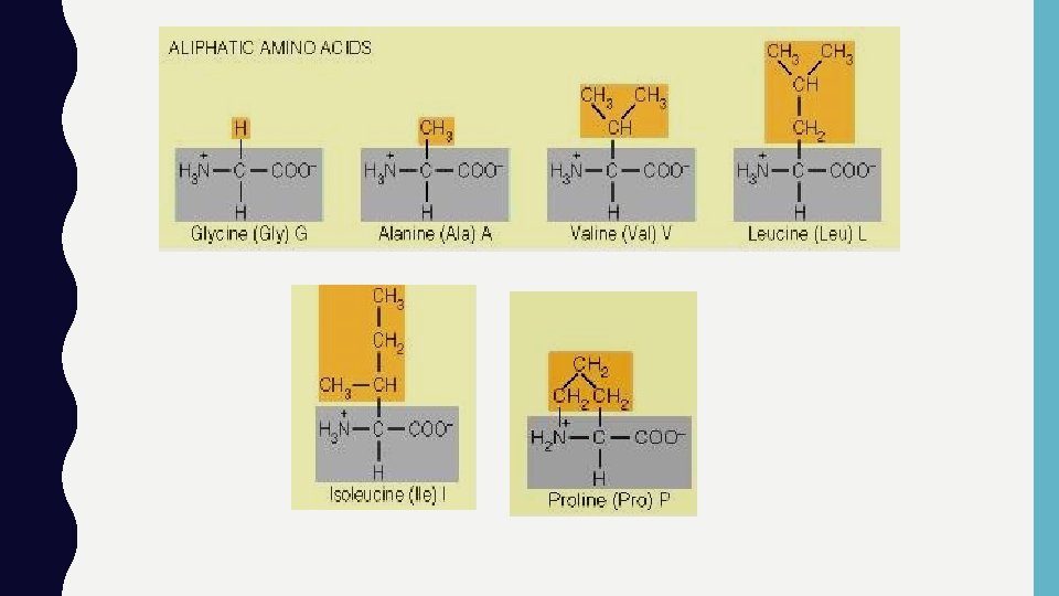 ASAM AMINO NON POLAR • Memiliki gugus R alifatik • Glisin, alanin, valin, leusin, isoleusin dan prolin • Bersifat hidrofobik. Semakin hidrofobik suatu asam amino spt isoleusine (Ile/I) biasa terdapat di bagian dlm protein. • Prolin berbeda dgn asam amino siklis. Tapi mempunyai banyak kesamaan sifat dengan kelompok alifatis ini. • Umum terdapat pada protein yang berinteraksi dengan lipid