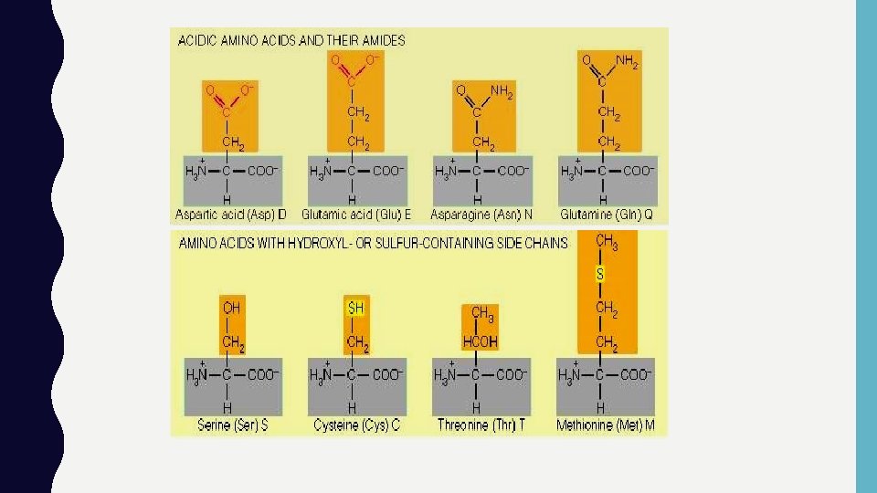 ASAM AMINO POLAR • Memiliki gugus R yang tidak bermuatan • Serin , threonin, sistein, metionin, asparagin, glutamin • Bersifat hidrofilik mudah larut dalam air • Cenderung terdapat di bagian luar protein • Sistein berbeda dgn yg lain, karena gugus R terionisasi pada p. H tinggi (p. H = 8. 3) sehingga dapat mengalami oksidasi dengan sistein membentuk ikatan disulfide • (-S-S-) sistin (tidak termasuk ke dalam asam amino standar karena selalu terjadi dari 2 buah molekul sistein dan tidak dikode oleh DNA)