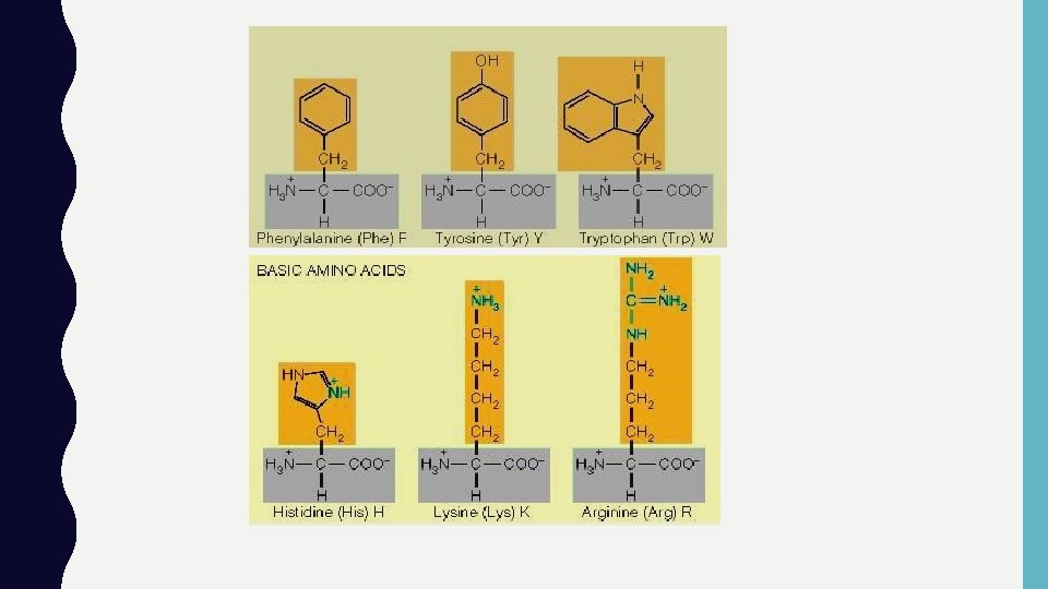 ASAM AMINO DENGAN GUGUS R AROMATIK • Fenilalanin, tirosin dan triptofan • Bersifat relatif non polar hidrofobik • Fenilalanin bersama dengan Valin, Leusin & Isoleusin asam amino paling hidrofobik • Tirosin gugus hidroksil , triptofan cincin indol • Sehingga mampu membentuk ikatan hidrogen penting untuk menentukan struktur enzim • Asam amino aromatik mampu menyerap sinar UV λ 280 nm sering digunakan utk menentukan kadar protein