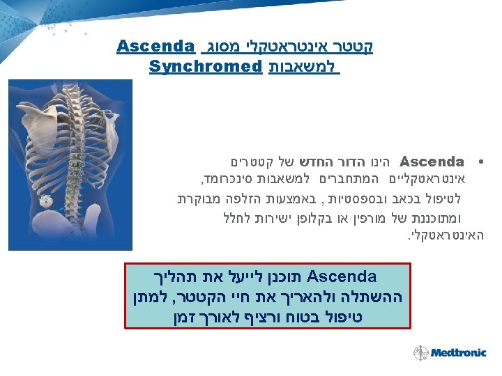 Ascenda Catheter This next generation catheter is designed to provide: – Greater confidence in a successful implant – Maximum durability facilitating uninterrupted therapy for patients