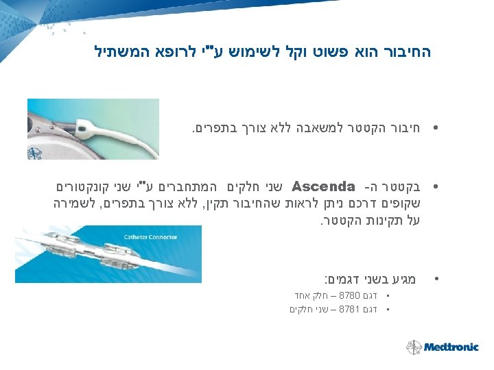 Improved Distal to Proximal Catheter Connector Previous Design Ascenda Design Stress Relief • Simple snap together design provides visual and tactile confirmation that the connection is secure • Provides additional stress relief for catheter bodies, previously a source of potential catheter tubing tears/leaks