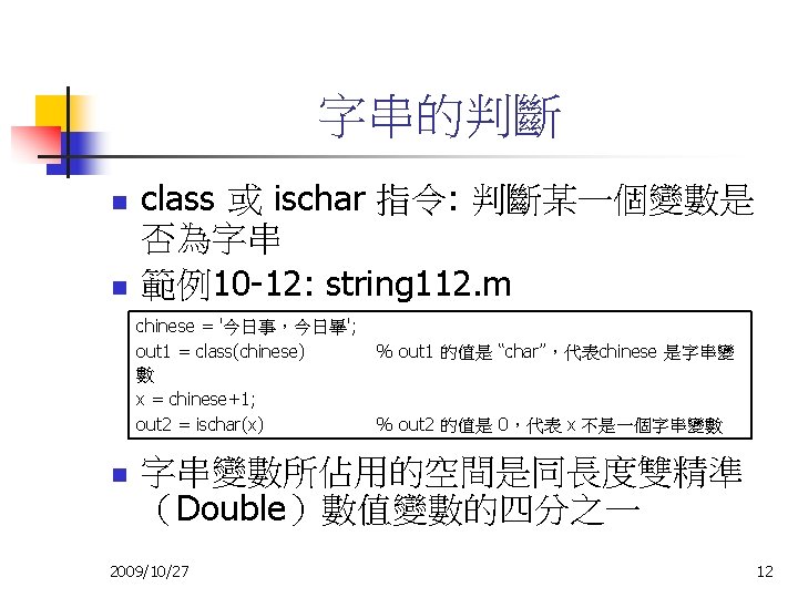 字元與字串的基本概念-eval n n eval 指令: 直接“執行”某一特定字串,其效果就如同直接在 MATLAB 指 令視窗內輸入此一特定字串 eval 指令特別適用於在 for - loop 內自動產生有規律的變數名稱 範例10 -11: string 111. m clear all for i = 3: 6 % 清除所有變數 eval(['x', int 2 str(i) , '= magic(' , int 2 str(i) , ') ; ']); end whos x* Name x 3 x 4 x 5 x 6 Size 3 x 3 4 x 4 5 x 5 6 x 6 Bytes Class 72 128 200 288 double array Grand total is 86 elements using 688 bytes n x 3 , x 4 , x 5 , x 6 都是在 for - loop 中產生的變數,分別代表維度為 3× 3、 4× 4、5× 5、6× 6 的魔方陣 2009/10/27 11