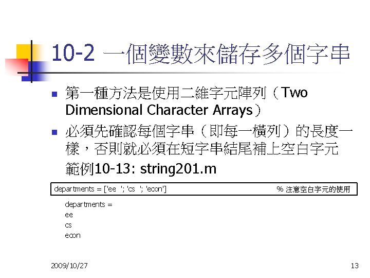 字串的分解 n n n strtok 指令: 根據一給定的分界字元(Delimiting Characters),將一字 串拆解成數個字串,預設分界字元為空白字元 strvcat 指令: 將拆解下來的字串內容(即儲存在字串變數 chopped 中) 加到二維字元陣列 parsed 中 範例10 -24: string 306. m input_string = 'ee cs econ stat me'; remainder = input_string; parsed = ''; % 建立一空字元陣列 while (any(remainder)) [chopped, remainder] = strtok(remainder); parsed = strvcat(parsed, chopped); end parsed = ee cs econ stat me 2009/10/27 18