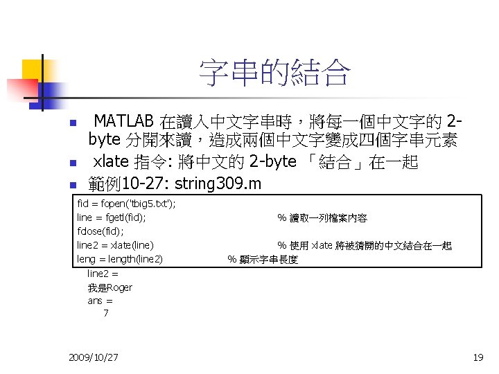 字串和其ASCII code n n n double 指令: 檢視字串變數的儲存內容(即 ASCII 內碼) char 指令: 將 ASCII 內碼轉回字串形式 範例10 -6: string 106. m sentence = 'I''ve got a date!'; sentence. Ascii = double(sentence); %檢視 sentence 的 ASCII 碼 sentence 2 = char(sentence. Ascii) % 將 ASCII 碼轉回字串形式 phraseascii = Columns 1 through 12 73 39 118 101 32 103 111 116 32 97 32 100 Columns 13 through 16 97 116 101 33 sentence 2 = I've got a date! 2009/10/27 6